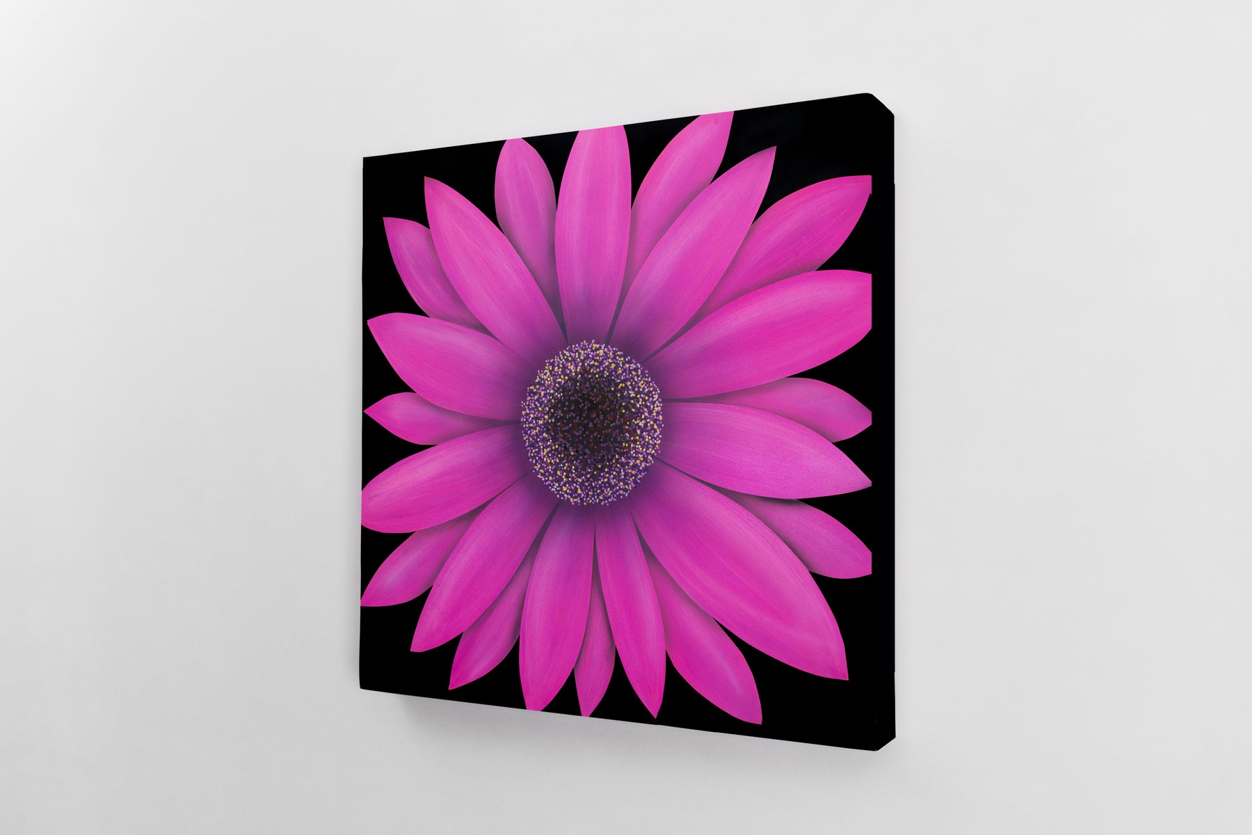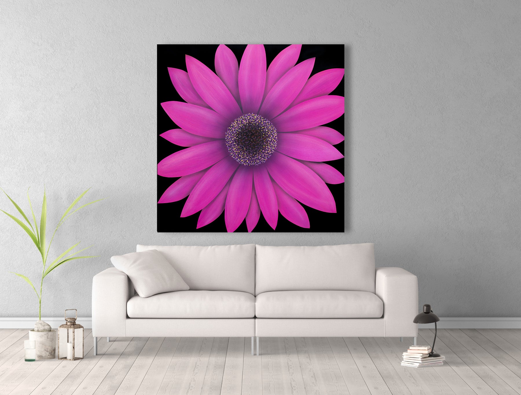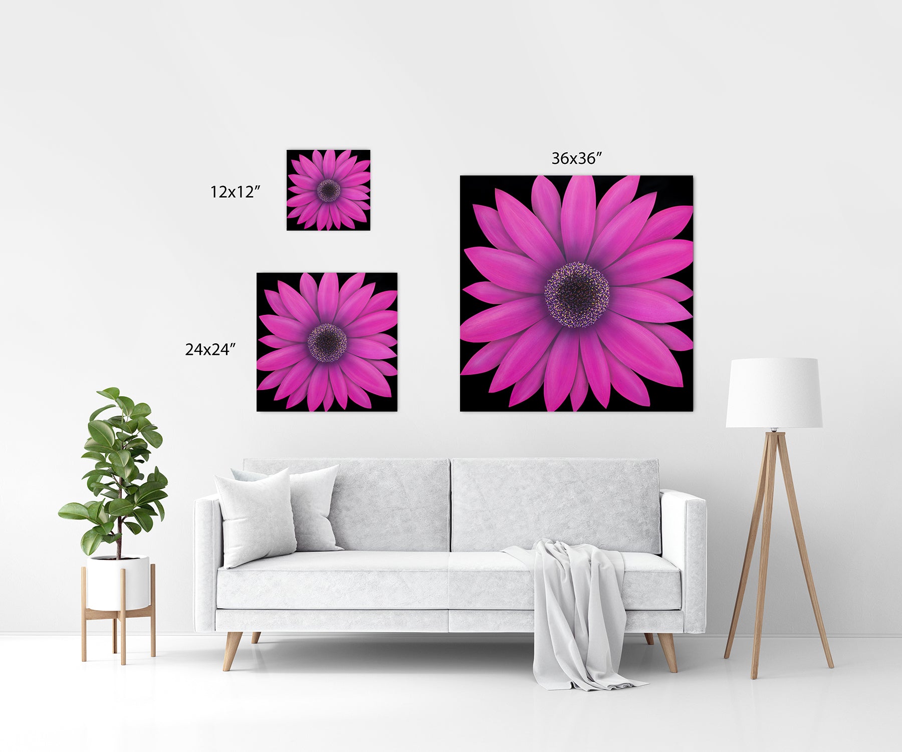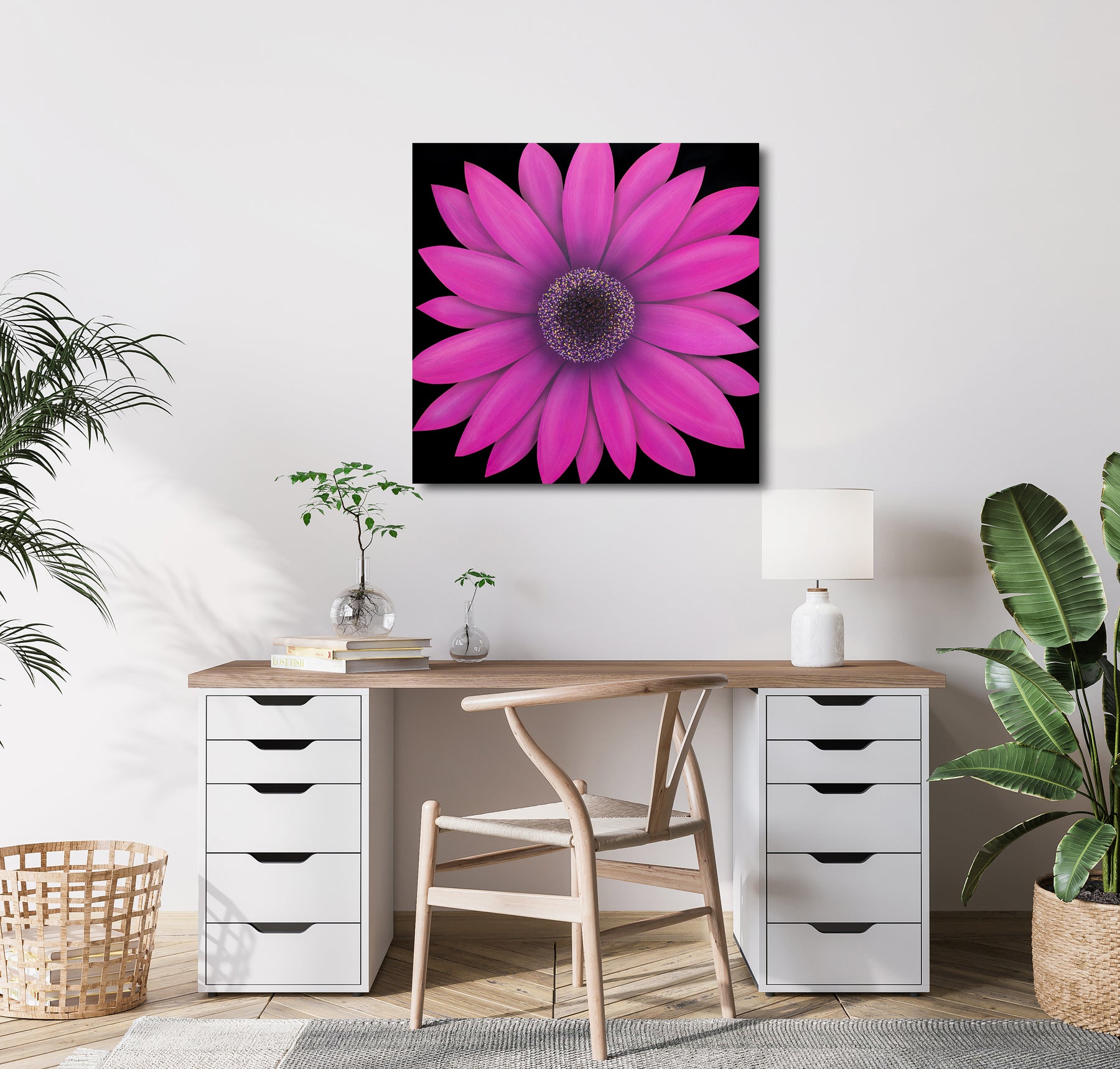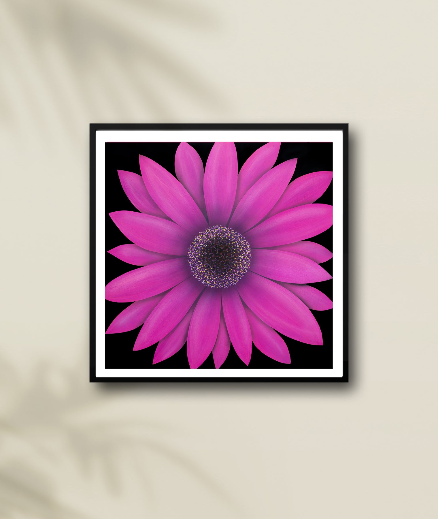 Radiating confidence, vibrancy, and elegance, Divine is a striking floral masterpiece that captivates with its bold presence. This stunning artwork features a vivid pink flower in full bloom, its velvety petals unfolding against a deep black background. The mesmerizing center, speckled with golden details, draws the eye inward, creating a sense of depth and refinement.