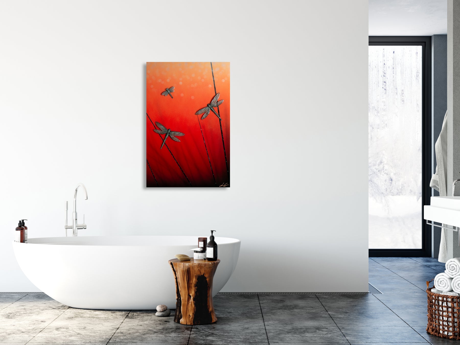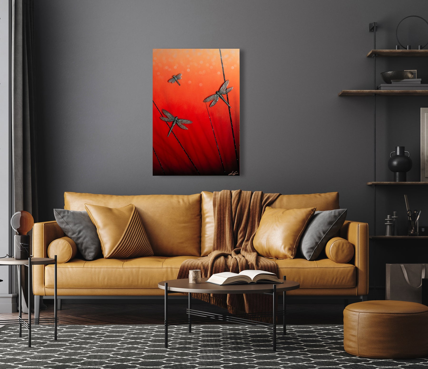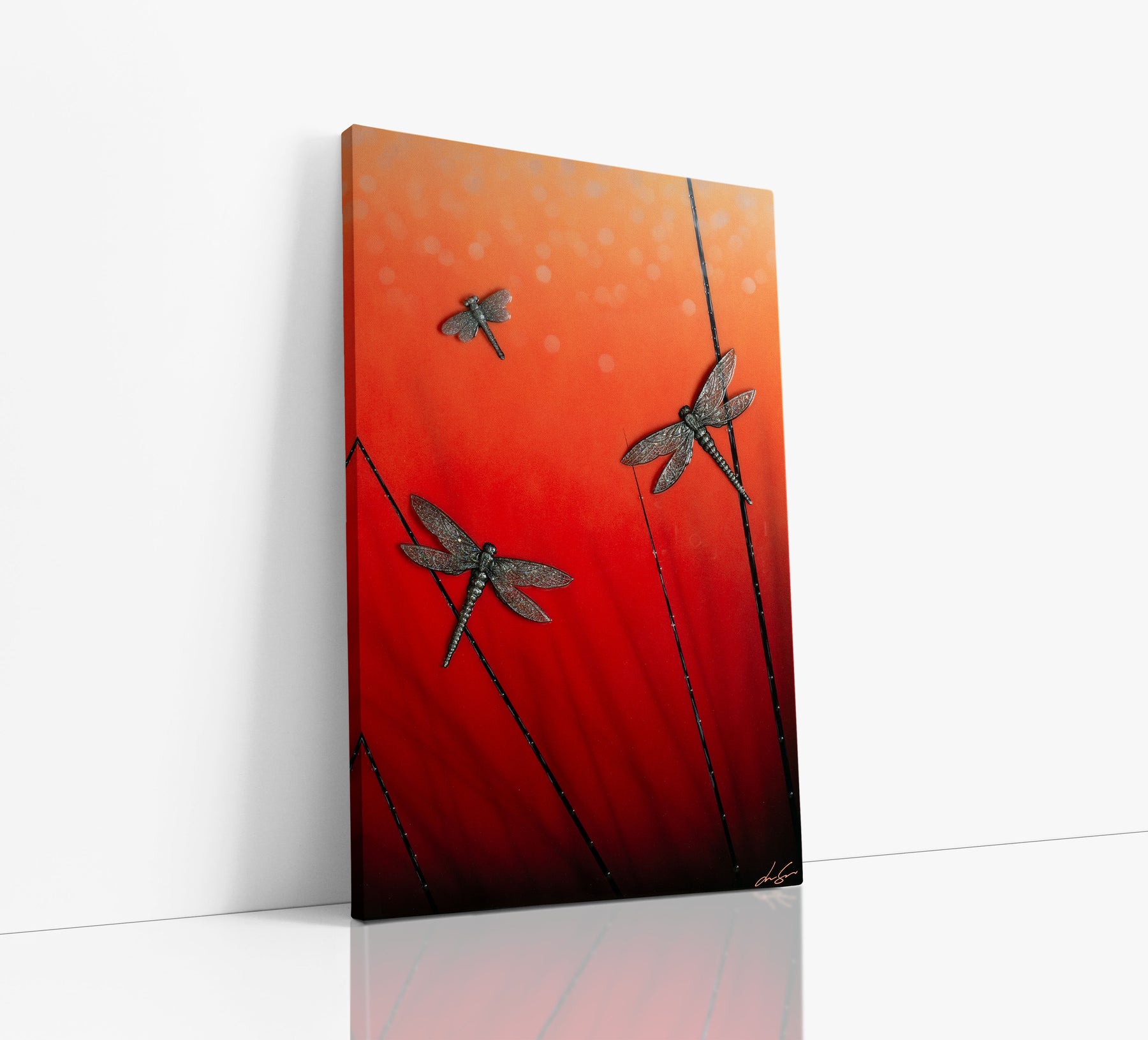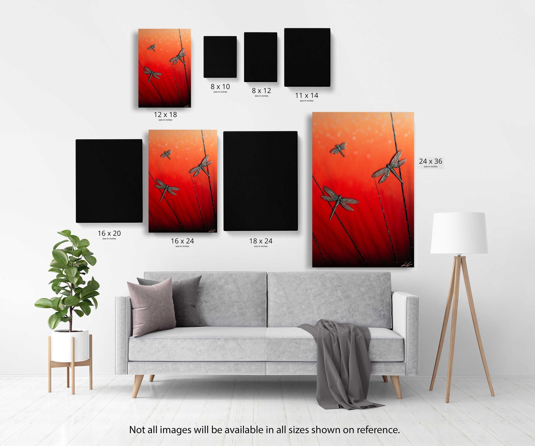 Bold, striking, and full of life, Red Carpet Ready captures the essence of elegance and movement as dragonflies dance against a vibrant sunset sky. The deep red and orange gradient sets the stage for these delicate creatures, their shimmering wings and intricate details standing out against the warm glow of evening light. The soft bokeh in the background adds an ethereal quality, evoking a sense of wonder and transformation.
